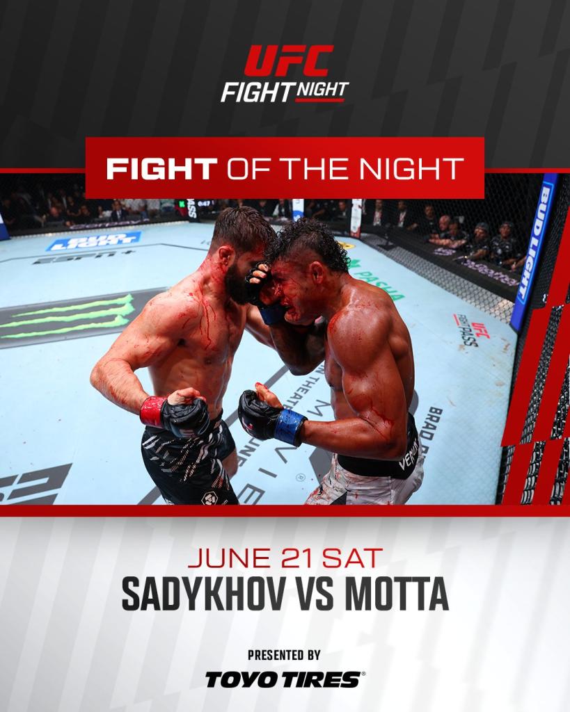 Nazim Sadykhov et Nikolas Motta ont été doublement récompensés pour leur performance spectaculaire. Dana White a confirmé que chacun recevra 100 000 $, cumulant les bonus de "Fight of the Night" et de performance. Un affrontement brutal et mémorable qui valait bien deux chèques. Nazim Sadykhov vs. Nikolas Motta